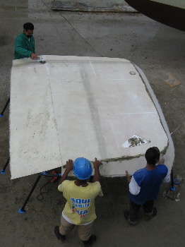 Most boats come out of the factory with gelcoat on the hull. Gelcoat can last a long time (20+ years), and when it gets old and dull, most folks paint over it because re-gelcoating can be very expensive. Slip Away's hull had been dull for quite a while, and although we considered painting it, Cartagena is well known for doing good gelcoat work. We could have our hull re-gelcoated here for a fraction of what it would have cost to have it painted in the States. Slip Away's hull is now bright and shiny, and she's sporting some new colors. Instead of the big blue Islander Freeport stripe, we went with a smaller accent stripe in maroon ("vino tinto" or "red wine" in Spanish).