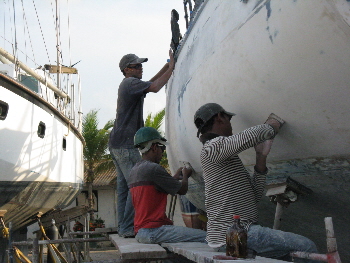 Thoughts on Refitting in Colombia Overall, we are pleased with the results of the work we had done in Cartagena. They're not perfect, but we feel we got good value for the money we spent. Our best guess is that the work we had done in Colombia ended up costing us about 30% of what it would have cost in the U.S. Although the work was cheap, management of the project came with some challenges, and as North Americans working within the Latin American culture, we found ourselves quite frustrated at times. Some of the frustration was just attributable to undertaking such a large project, and we would have had to deal with some headaches no matter what country we chose to do the work in. Probably the greatest challenge of all was the language barrier. We've spent a fair amount of time in Spanish-speaking countries, and we've learned basic Spanish, but we are not fluent by any stretch of the imagination. Also, accents and expressions change across different parts of Latin America, and since this was our first time in Colombia, it took a little time for us to develop an ear for their accent and learn some of those expressions. Our primary contractor, Flavit, spoke some English, and between his English and our Spanish (and our Spanish-English dictionary), we could almost always understand one another. If Flavit spoke to us in Spanish, he was good about using basic words and speaking slowly. There were a few occasions when he spoke Spanish to us at a normal rate, but when he saw the blank looks on our faces, he slowed down or mixed in some English. Most of the other vendors spoke no English, and we could usually muddle through, but when we had a problem understanding, we often went to Flavit for help. The Shipyard Assistant, Pura, was fluent in both languages, and she was also always willing to help us out. In general, we have found the people of Latin America to be very warm and pleasant people, and the Colombians were no exception. We really liked most of the local people we met and dealt with. We had some frustration with vendors not showing up when they said they would - "maņana" doesn't necessarily mean "tomorrow" in Colombia either. However, Flavit and his crew were exceptionally dependable and worked very hard. They showed up every day, on time, sometimes early, and there were a few weeks when they worked all seven days. Although they worked hard and we were generally happy with the quality of their work, they were sometimes careless, so they spent more time than we would have liked correcting mistakes. For instance, after painting our mizzen mast, they set it on top of a couple of barrels so that Rich could reinstall the hardware. They did not put any padding between the mast and the barrel, so the mast got scratched, and they had to repair it. Another time, when they painted the decks, they covered the acrylic front hatch with newspaper to protect it from the paint. In between covering the hatch and painting, it rained, and the newspaper disintegrated in a few places. They went ahead and painted, got some overspray on the acrylic, and had to spend time cleaning that up. Fortunately, we were not paying them by the hour! The lower cost of boat work in Colombia was primarily attributable to cheap labor. Materials were often expensive and sometimes not available. The local brands of paint and gelcoat were reasonably priced, but it was cheaper for us to buy all of the supplies to make our cockpit enclosure (canvas, thread, strataglass, fasteners) in the U.S. and pay the shipping to Colombia than it would have been to buy it locally. Duct tape was sold at the local hardware store, but it cost about $8/roll, and the 3M blue tape that we use on paint projects was nowhere to be found in Cartagena. We tried to bring with us as much of the materials that we knew we would need, but it's not always easy to think of everything. Yard prices (haul and launch $450; laydays of $21/day) were comparable to what one might find in a moderately priced area of the U.S., but one gets more for the money at a U.S. boatyard than here. Electricity and water hookups at this yard were well below acceptable U.S. standards, and OSHA would have a fit if they saw the condition of the scaffolding provided by the yard. One of the big bonuses of the Ferroalquimar Boatyard were the on-site apartments, which rented for $18/day. Accommodations were basic, but we were happy to have them because it would have been difficult to impossible to live aboard Slip Away during much of the construction. Although we could have rented a cheaper apartment in the downtown area of Cartagena, having our living space right next to the boat was a convenience well worth the extra expense. Slip Away is over 30 years old, but now she looks almost new. She has been our home for eight years, and it is our intention that she will continue to be our home for many more years as we travel with her to more distant shores. She was functional with her old gelcoat and peeling paint, but we're very happy that she now looks nice too. Although maintenance and repair will always be a part of our life on Slip Away, we're hoping that for the foreseeable future, the major re-fitting projects are behind us. |